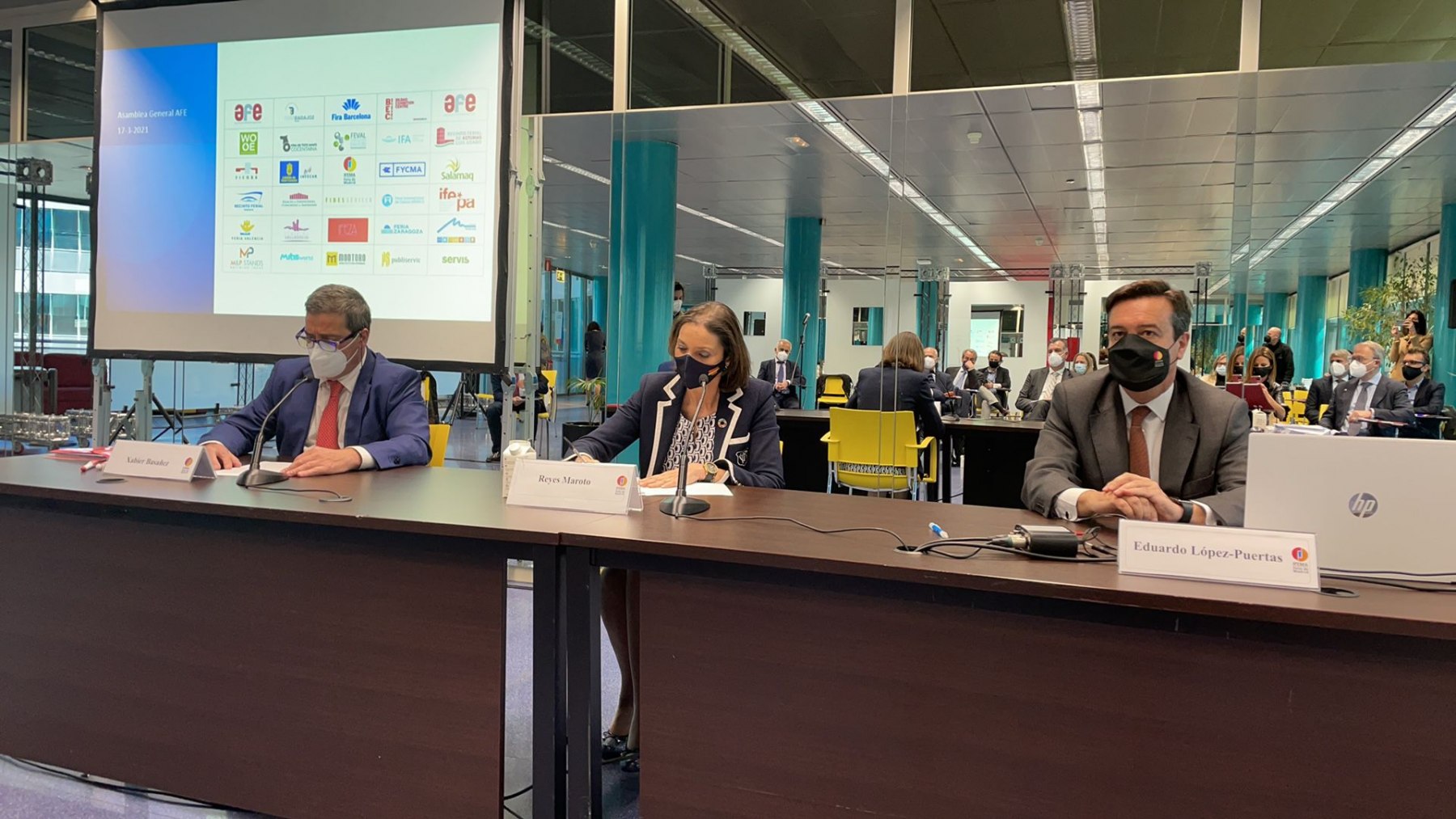 Reyes Maroto va mostrar la seva satisfacció per la participació en l'Assemblea de forma presencial i ha destacat que els recintes firals, gràcies als estrictes protocols, efectivament són espais segurs. Ha reiterat el seu suport a el sector que ja va expressar en una altra reunió virtual de treball celebrada al maig, i va reconèixer públicament l'esforç, professionalitat i treball dels que fan possibles les fires comercials. També va al·ludir a les pròximes fires programades, Fitur al maig, al Mobile World Congress a finals de juny, o la fira HIP, d'hostaleria, la propera setmana a Madrid. La celebració d'aquestes i altres fires permetrà demostrar que es poden dur a terme, amb molta responsabilitat i fent les coses molt bé, de manera que siguem un exemple per a altres països.